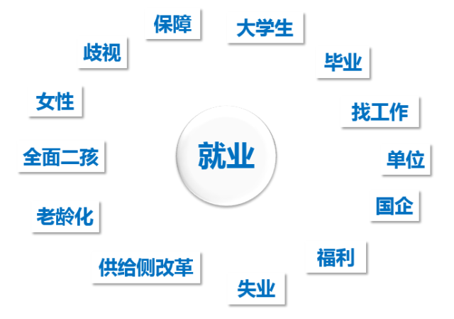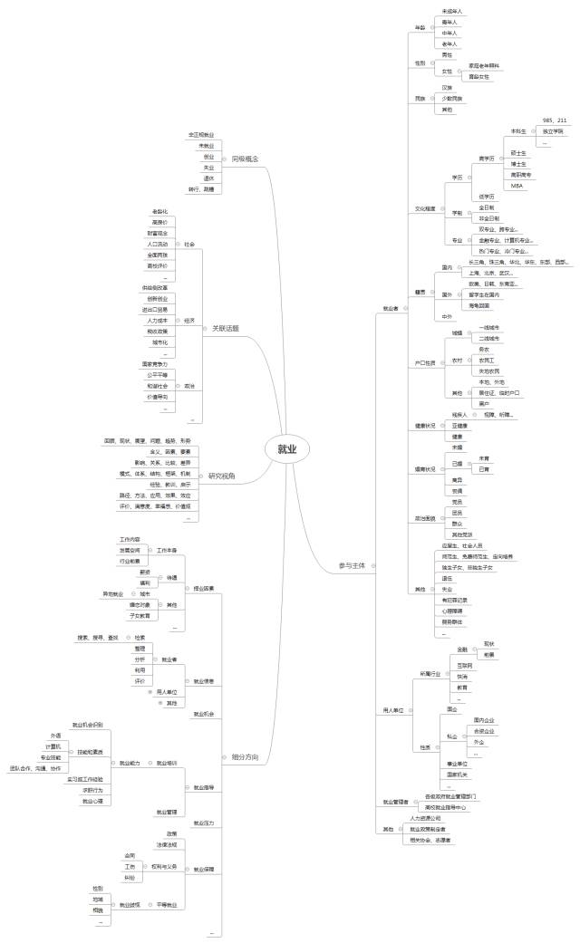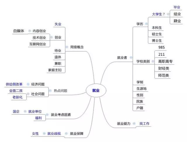 如果已经有一个大致方向,还可以借助思维导图这个可以启发思路的工具,来找到更多关联概念。比如,围绕着“就业”这个概念,可以联想到很多相关概念。