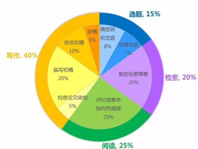 明尼苏达大学图书馆给出了完成一篇研究论文的大致时间分配,其中,建议15%的时间用于选题、20%的时间用于制定检索策略、25%的时间用于批判性阅读、40%的时间用于写作。