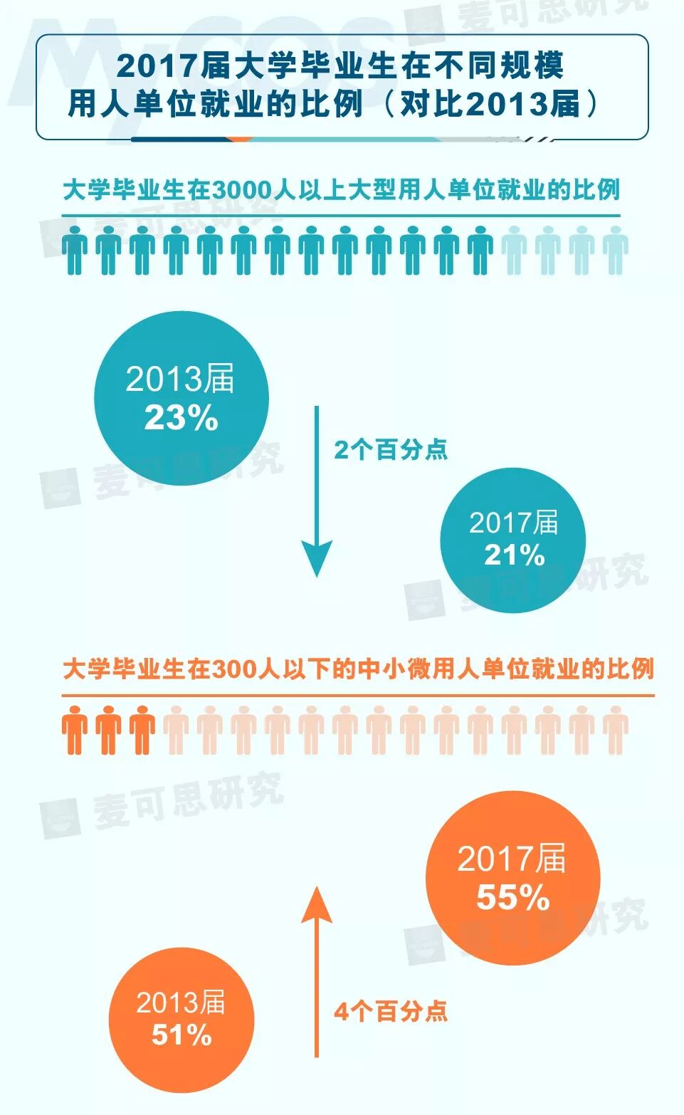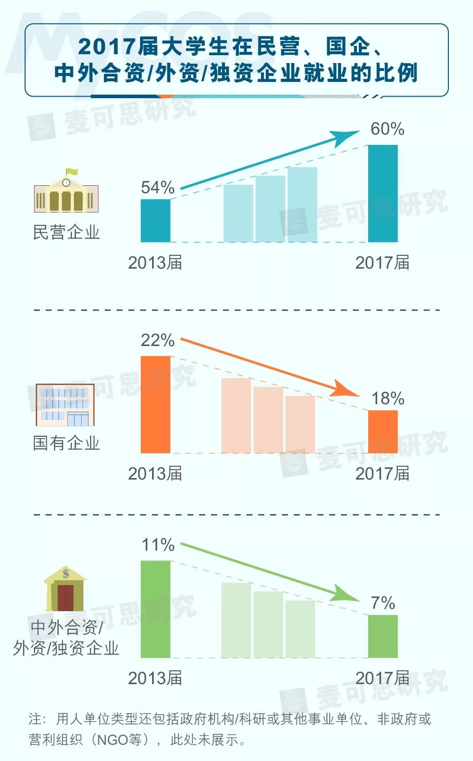 大学毕业生在民营企业就业的比例从2013届的54%上升为2017届的60%,与此同时,在国有企业就业的比例从2013届的22%下降到2017届的18%,在中外合资/外资/独资企业就业的比例从2013届的11%下降到2017届的7%。