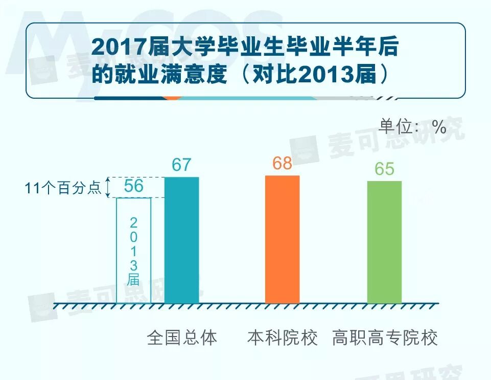 2017届大学毕业生的就业满意度为67%。其中,本科院校2017届毕业生的就业满意度为68%,高职高专院校2017届毕业生的就业满意度为65%。近五届大学毕业生就业满意度持续上升(2013届大学毕业生就业满意度为56%)。