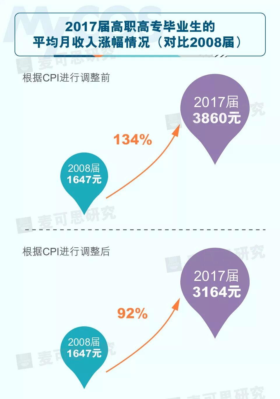 2008~2017届高职高专毕业生的平均月收入从1647元增长到3860元,增幅为134%。在根据CPI进行调整后,2008~2017届高职高专毕业生的平均月收入从1647元增长到3164元,增幅为92%。