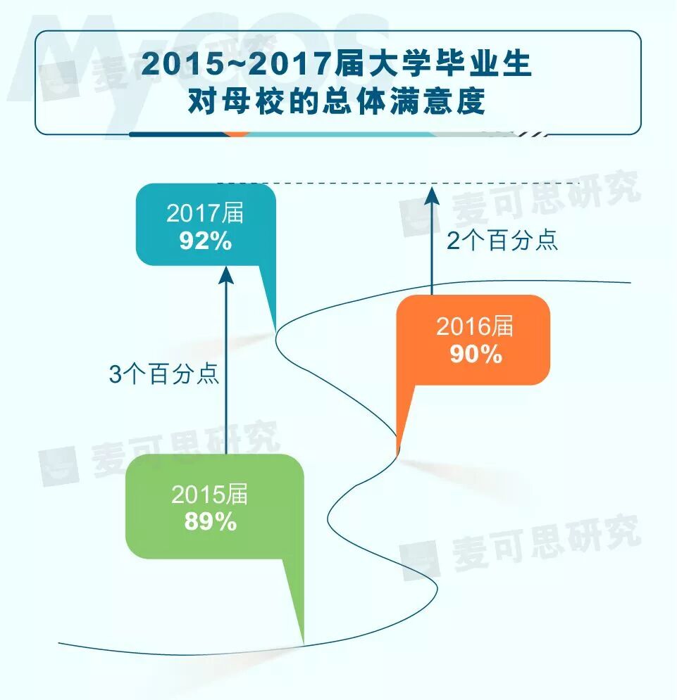2017届大学毕业生对母校的总体满意度为92%,比2016届(90%)高2个百分点,比2015届(89%)高3个百分点。从近三届的趋势可以看出,大学毕业生对母校的总体满意度呈现上升趋势。