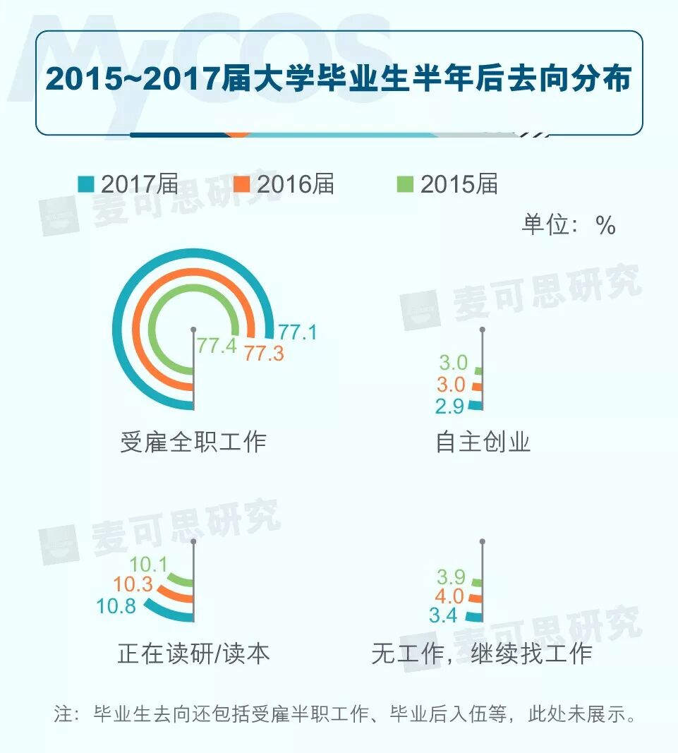 2017届大学生毕业半年后“受雇全职工作”的比例(77.1%)与2016届、2015届(分别为77.3%、77.4%)基本持平;“自主创业”的比例(2.9%)与2016届、2015届(均为3.0%)基本持平;“正在读研/读本”的比例(10.8%)略高于2016届、2015届(分别为10.3%、10.1%);“无工作,继续寻找工作”的比例(3.4%)略低于2016届、2015届(分别为4.0%、3.9%)。
