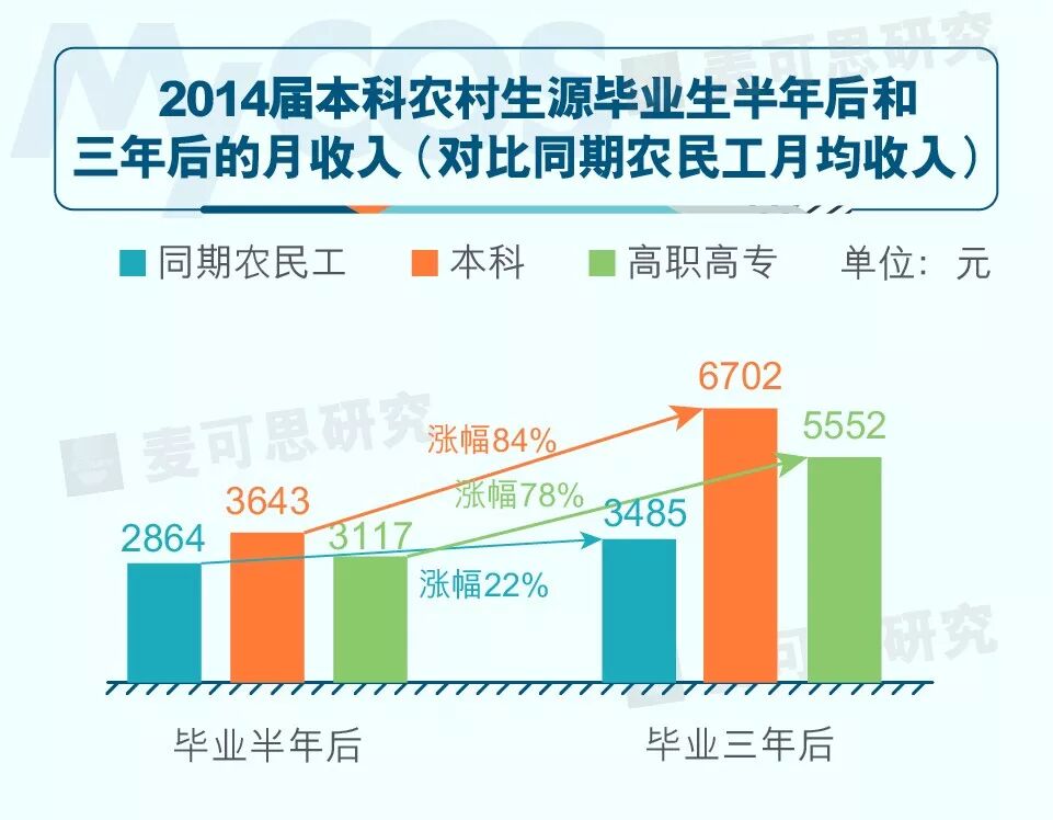 2014届本科农村生源毕业生半年后的月收入为3643元,高于同期农民工月均收入(2864元)①;到了毕业三年后收入上的优势明显扩大,2014届本科农村生源毕业生三年后(即2017年时)月收入为6702元,与毕业半年后相比涨幅为84%,明显高于同期农民工(2017年月均收入3485元②,与2014年相比涨幅为22%)。