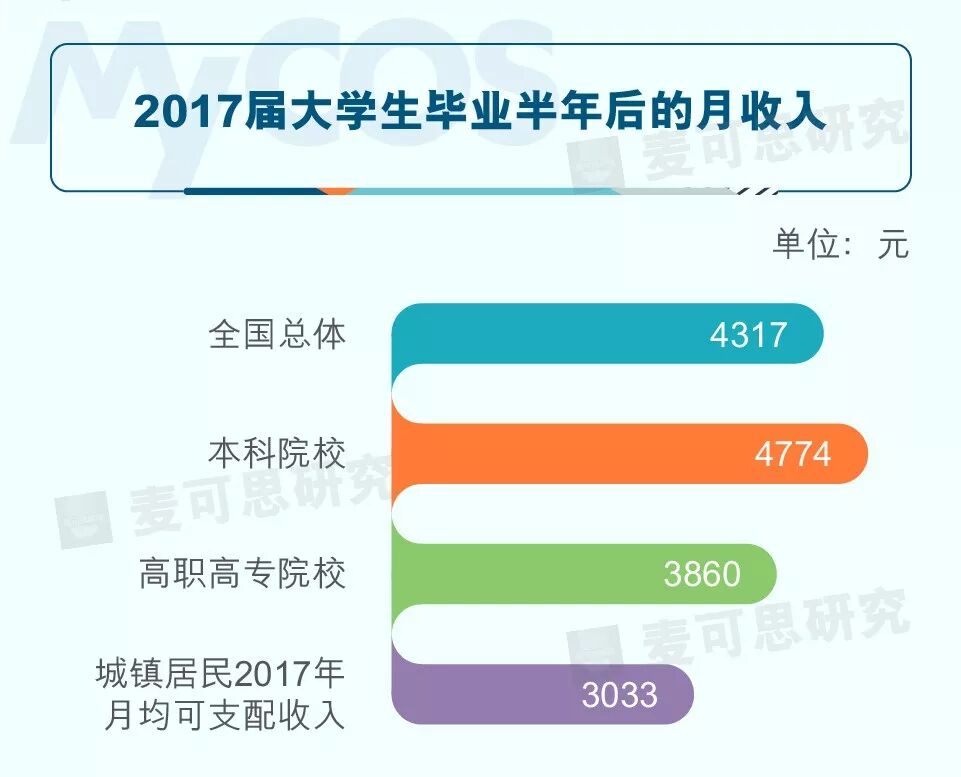 2017届大学毕业生的月收入为4317元。其中,本科院校2017届毕业生的月收入为4774元,高职高专院校2017届毕业生的月收入为3860元,均明显高于城镇居民2017年月均可支配收入(3033元)。