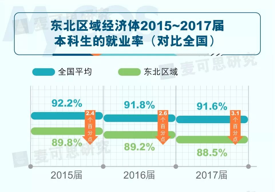 近三年东北区域经济体的本科毕业生就业率持续垫底,2017届88.5%、2016届89.2%、2015届89.8%,比全国本科平均就业率(91.6%、91.8%、92.2%)分别低出3.1、2.6、2.4个百分点。与此同时,东北地区留人难。与全国本地生源的本地就业比例相比,2017届本科东北生源在本地就业的占比(46.7%)低于全国平均水平(74.3%)27.6个百分点。