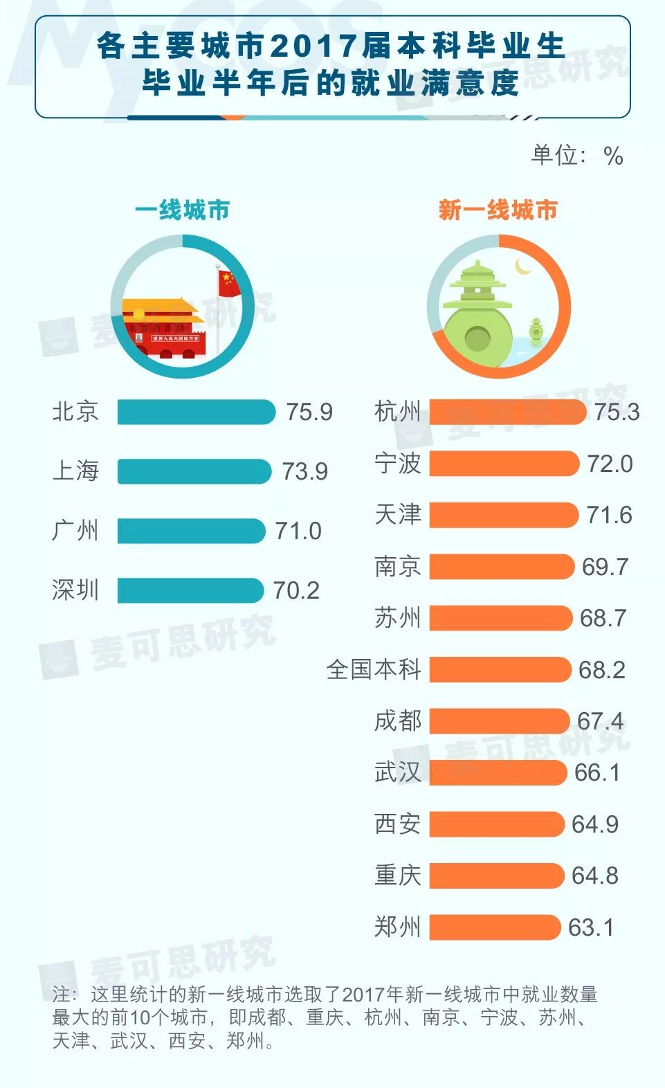 注意点:一线城市中“北京”、新一线城市中“杭州”的大学毕业生就业满意度较高。
