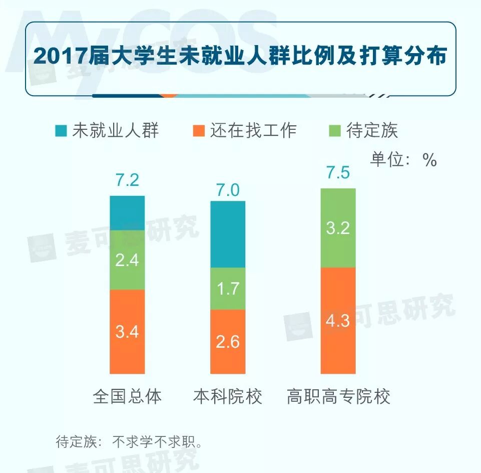 在2017届大学毕业生的未就业人群(7.2%)中,近半数还在继续找工作(3.4%)。其中,处于未就业状态的本科毕业生(7.0%)中“还在找工作”的为2.6%,“待定族”为1.7%(不求学不求职);处于未就业状态的高职高专毕业生(7.5%)中“还在找工作”的为4.3%,“待定族”为3.2%。