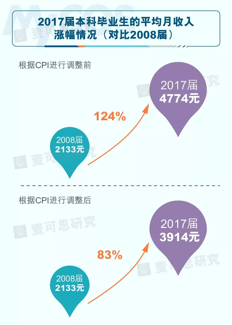 2008~2017届本科毕业生的平均月收入从2133元增长到4774元,增幅为124%。考虑到通货膨胀,在根据CPI(即居民消费价格指数,衡量通货膨胀程度的重要指标之一)进行调整后,2008~2017届本科毕业生的平均月收入从2133元增长到3914元,增幅为83%。