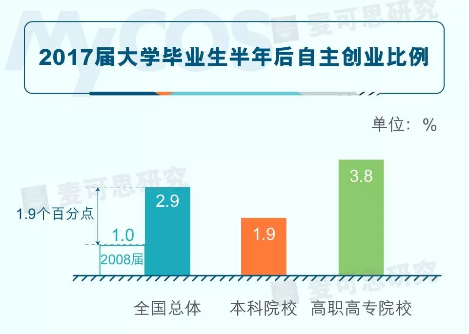 2017届大学毕业生半年后自主创业的比例为2.9%,其中,2017届高职高专毕业生半年后自主创业的比例(3.8%)高于本科毕业生(1.9%)。根据国家统计局《2017年国民经济和社会发展统计公报》发布的普通本专科毕业生人数735.8万估算,2017届大学生中约有21.3万人选择了创业。与2008届(1.0%)相比,近十年增长了1.9个百分点。