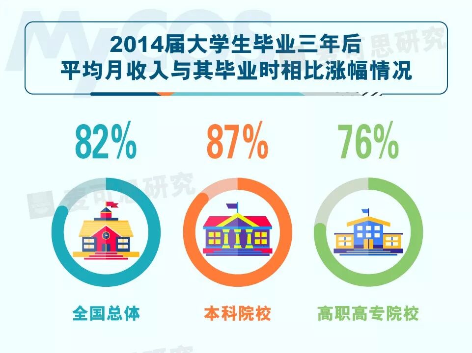 注意点:2014届本科毕业生三年后月收入相比毕业时增长87%,高职高专增长76%。高职高专毕业三年后薪资增长放缓。