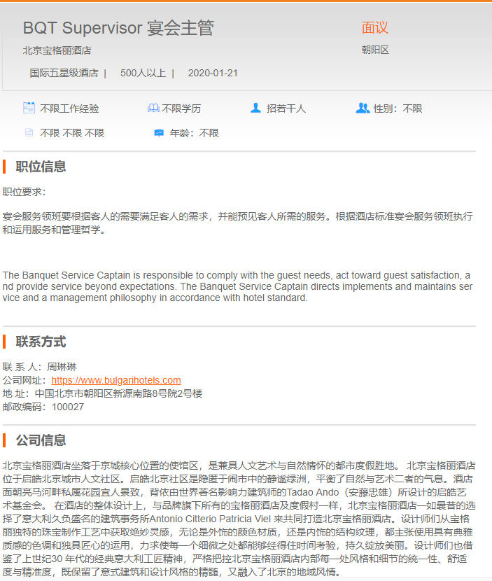 北京宝格丽酒店宴会主管