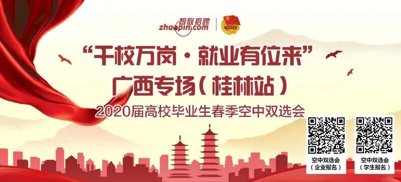 广西学联携手智联招聘,共同推出“千校万岗·就业有位来”空中双选会广西专场(桂林站)!报名时间为2020年4月7日至28日,你还在等什么?快来参加吧!