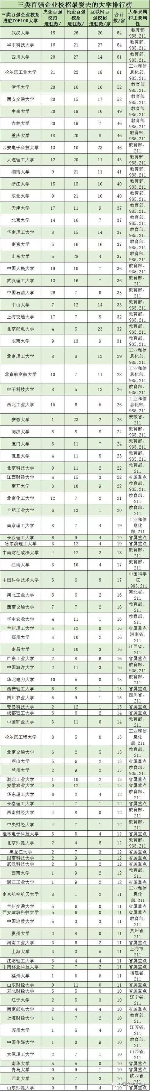 下面这个表为我们统计了央企百强校、民企百强、互联网百强企业校招喜欢去高校,下面这个表里有你所在的大学吗?